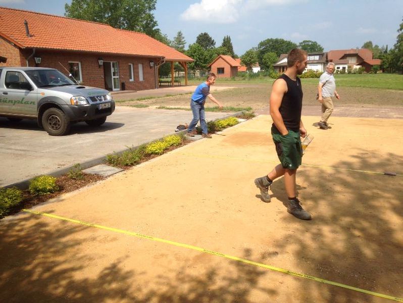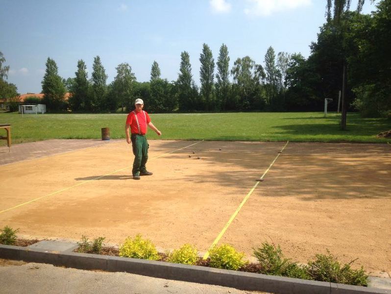 Die Arbeiten begannen am 02. April 2016 mit dem Ausheben des alten Untergrundes und setzten sich an den folgenden Wochenenden fort; Schotter auffüllen, Randbefestigung und Stromanschlüsse verlegen, Sitzfläche pflastern, Bouleuntergrund auftragen, usw..